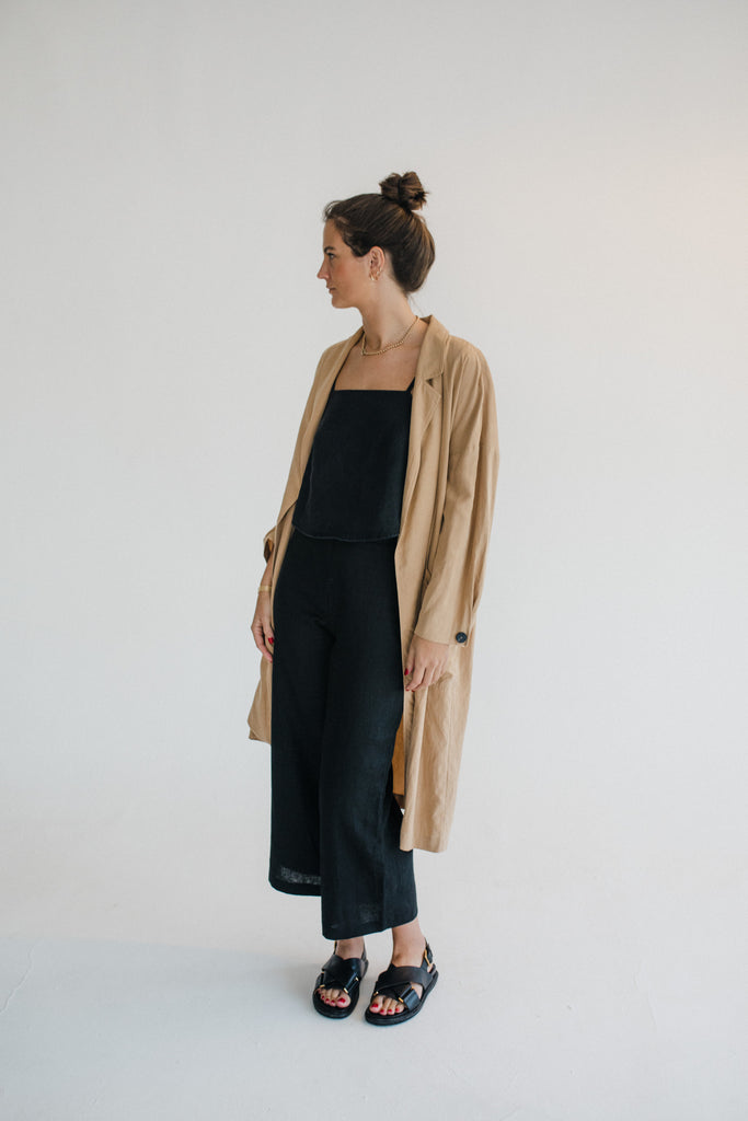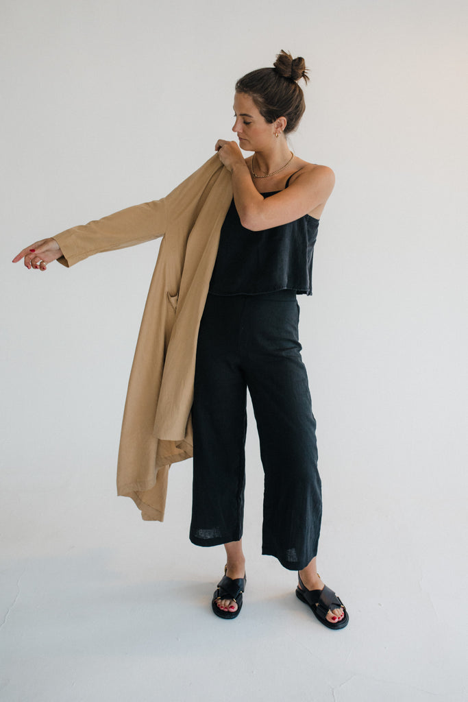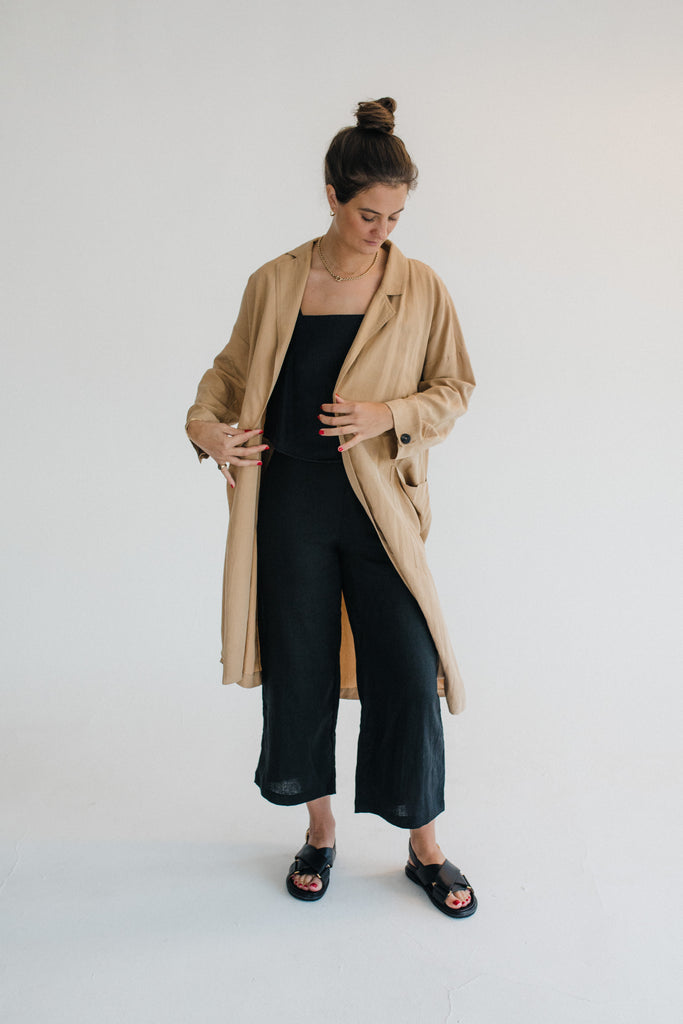 Janni & GeorgeThe Palazzo Crop Trouser is a relaxed, yet more formal trouser compared to our tie trousers. With an elasticated band at the back and a zip on the side seam, the fit is comfortable and forgiving. For our taller customers, the trousers will be more of a crop trouser, whereas for our shorter customers, the trousers will be around ankle-length.