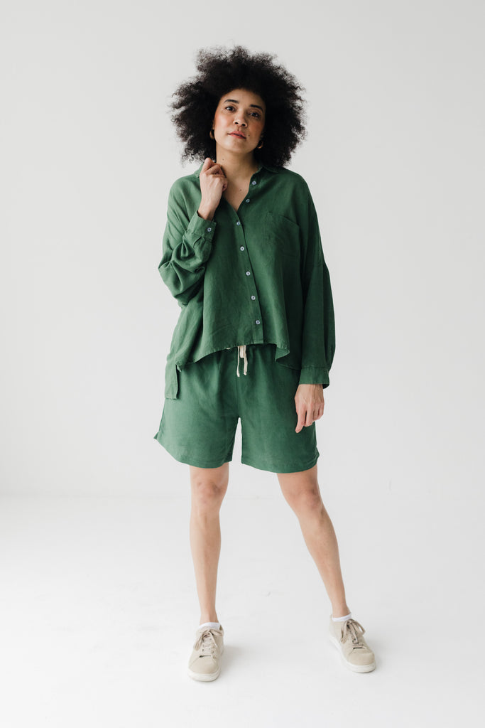 Mid-rise fit, sits just below the belly button. The Midi Linen Shorts fit slightly longer on the leg compared to the regular Linen Shorts.