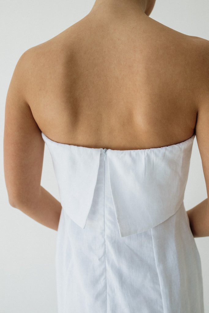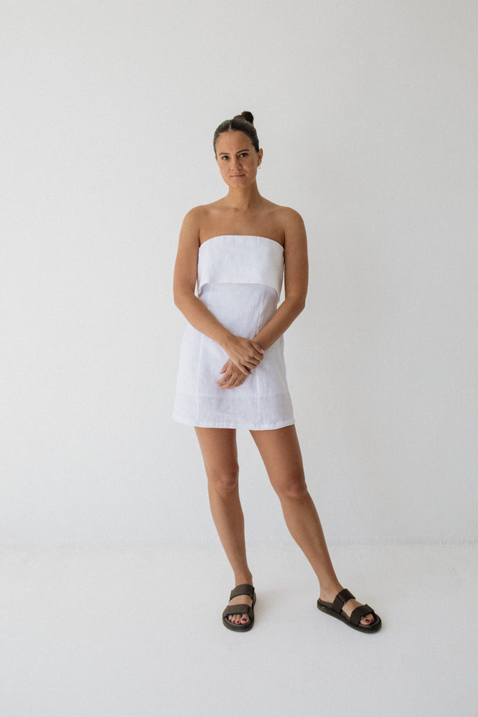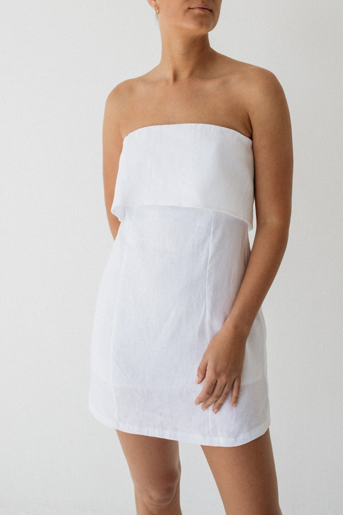 Janni & GeorgeThe perfect strapless mini dress for those balmy summer evenings. An elasticated seam around the bust, as well as a back zip allow for a flexible fit.