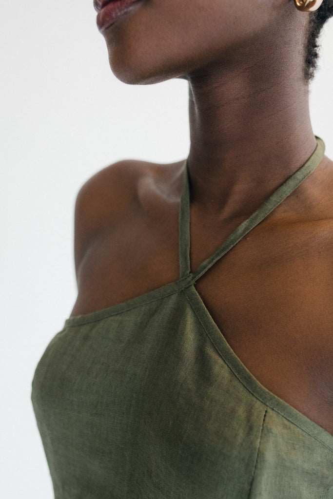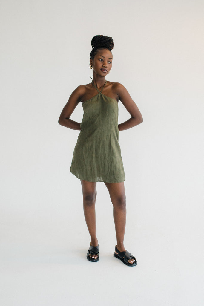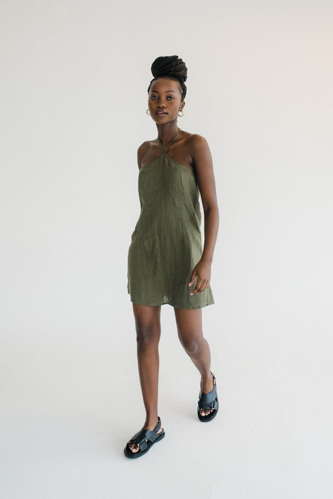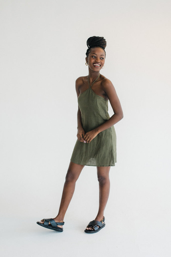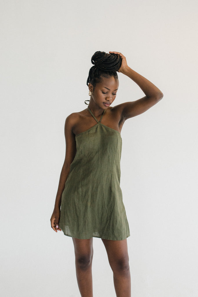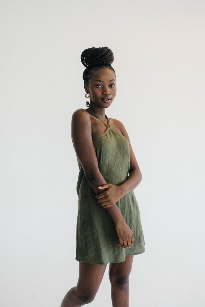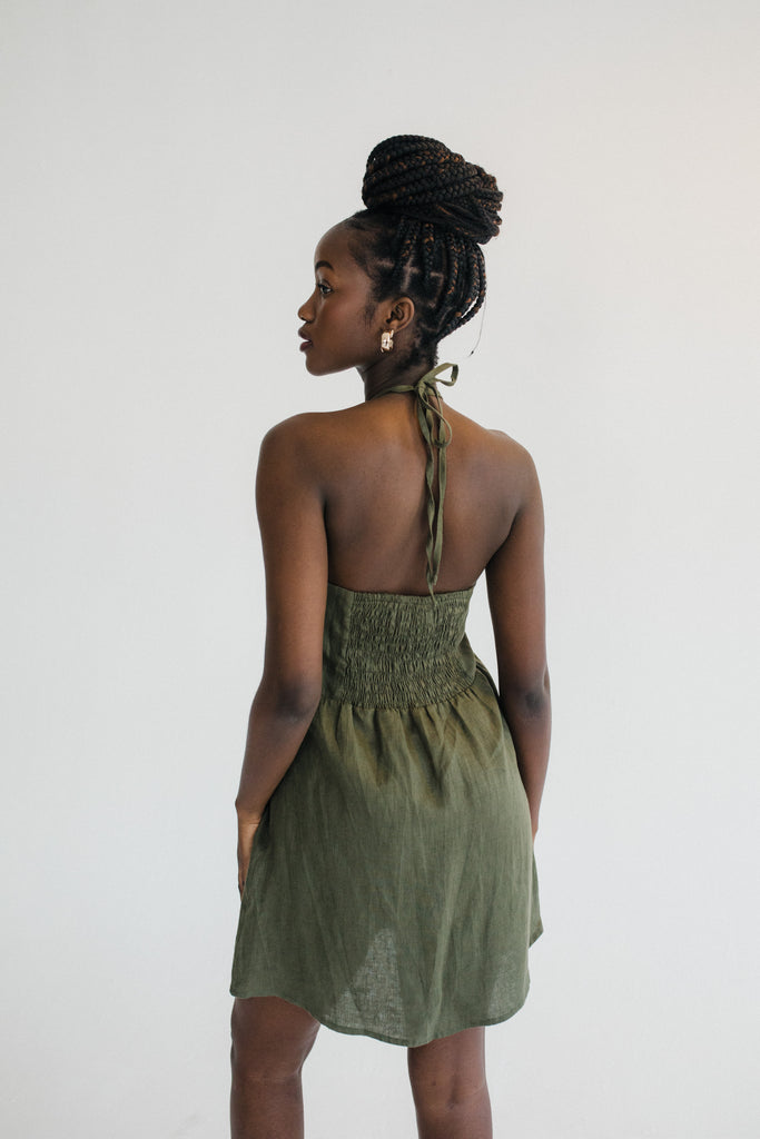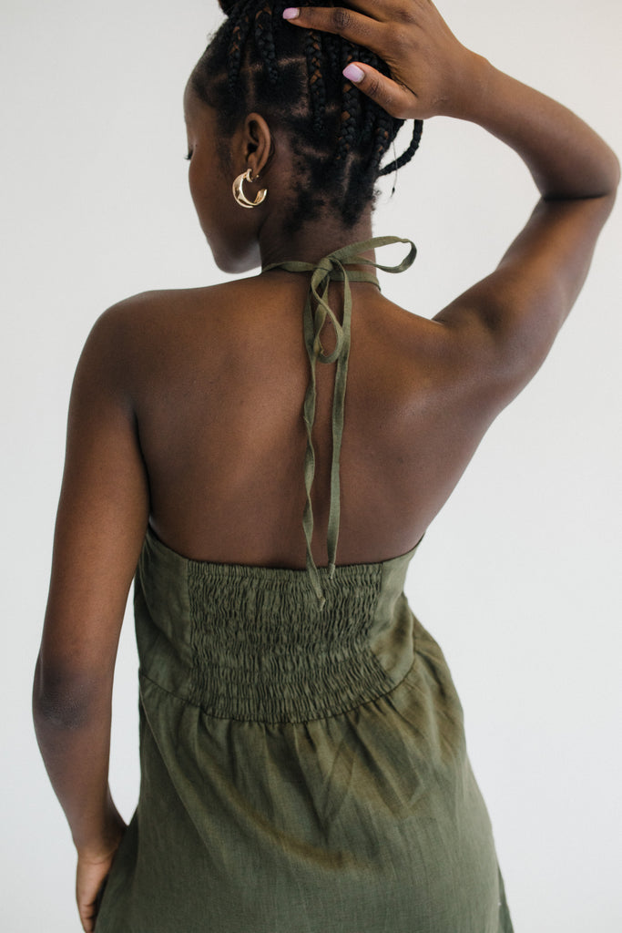 This halter style mini dress will be your go-to dress this Summer. The dress is a mini dress and is on the shorter side, so take your usual size or size up. It has an elasticated back so the fit is flexible around the bust and waist. Adjustable tie around the back of the neck. Made from 100% linen.