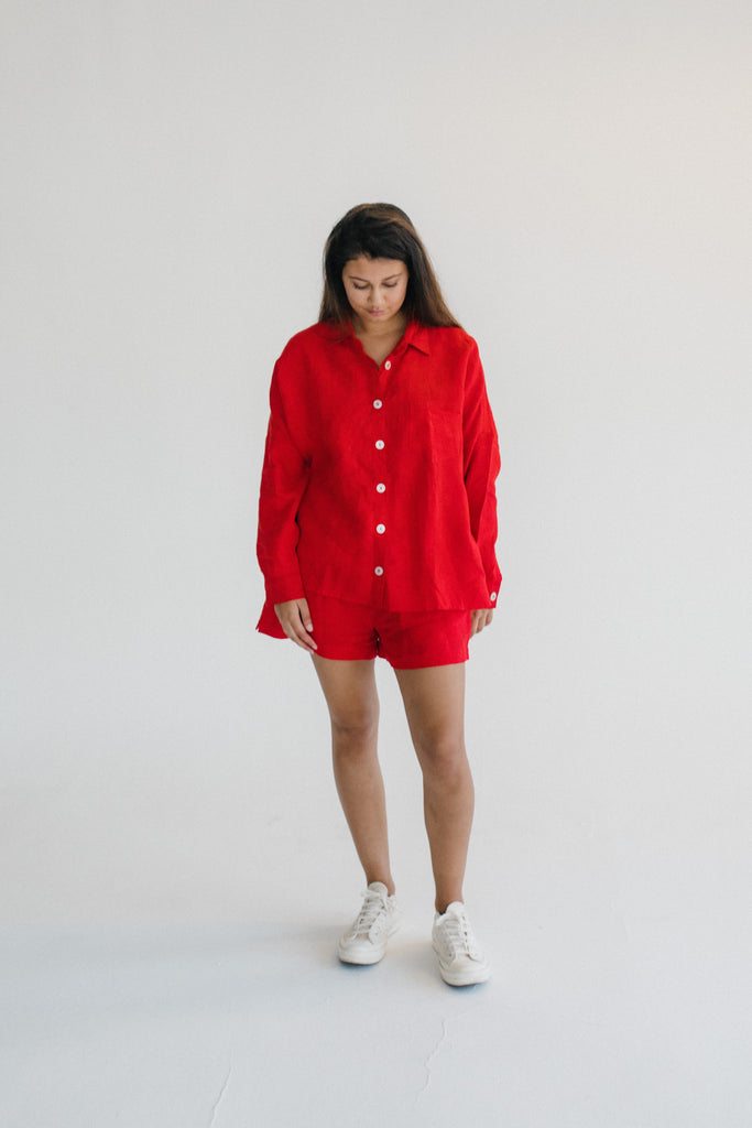 Relaxed fit button-up linen shirt with a dropped shoulder and a high low hem. This item is a generous fit, so opt for your normal size or a size down – we don’t recommend sizing up on this garment.