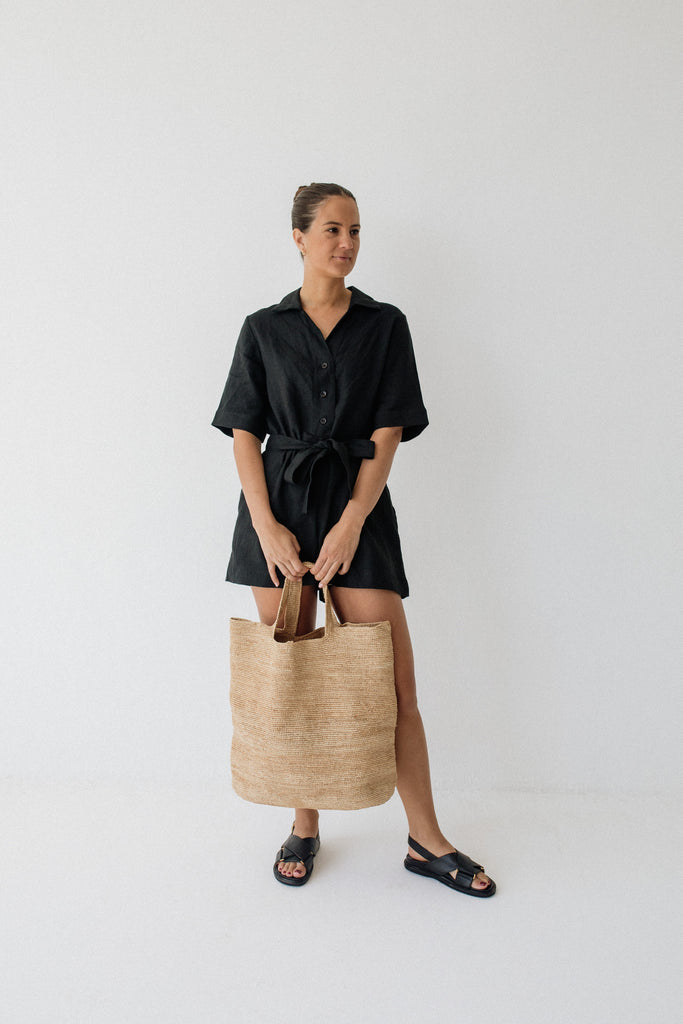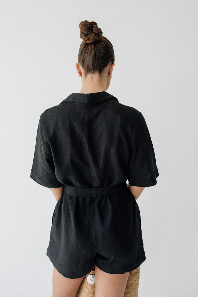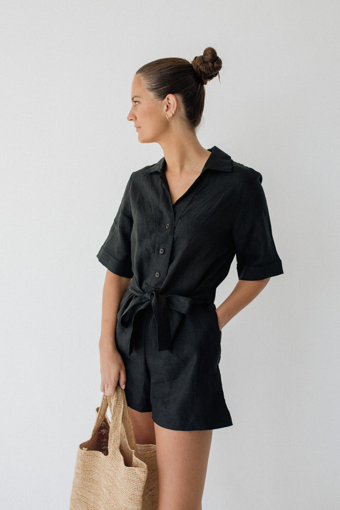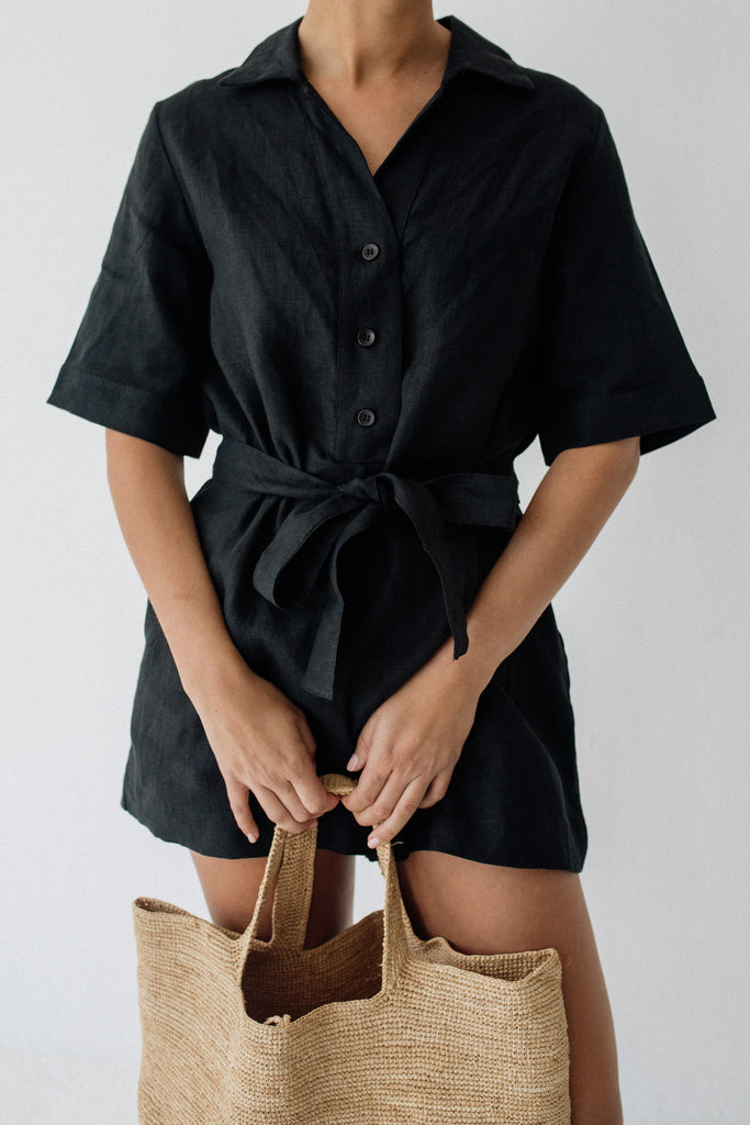 Janni & GeorgeRelaxed fit playsuit with separate tie. Can be worn with or without tie. The dropped shoulder and short leg create a boxy silhouette. The playsuit has a relaxed, boxy fit.
