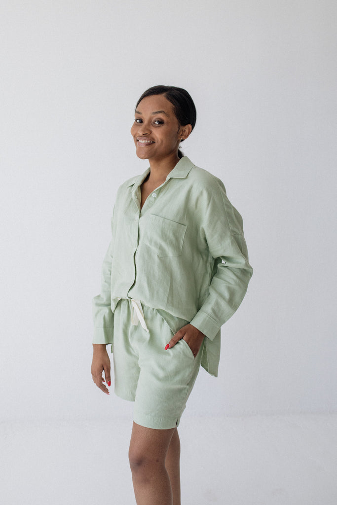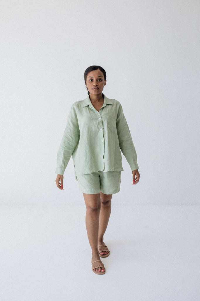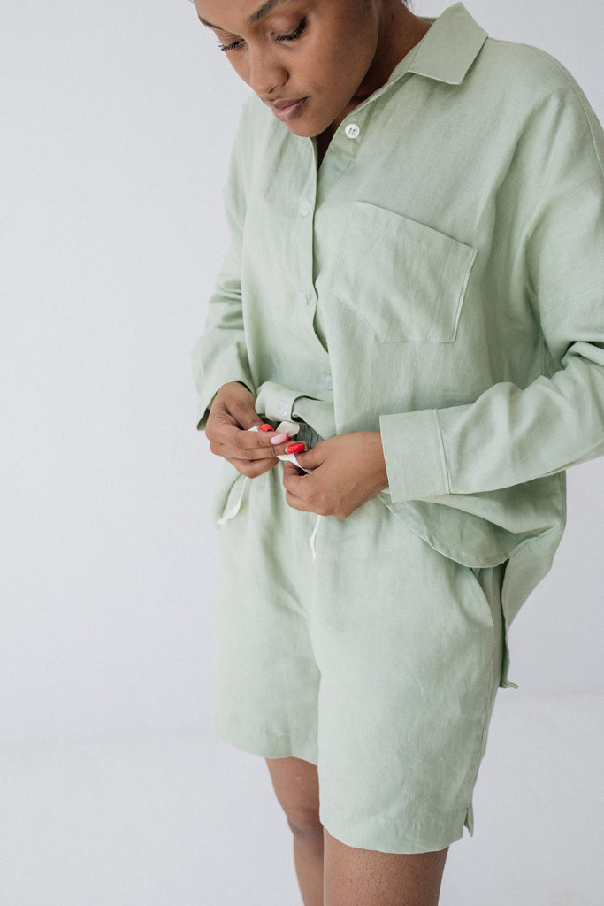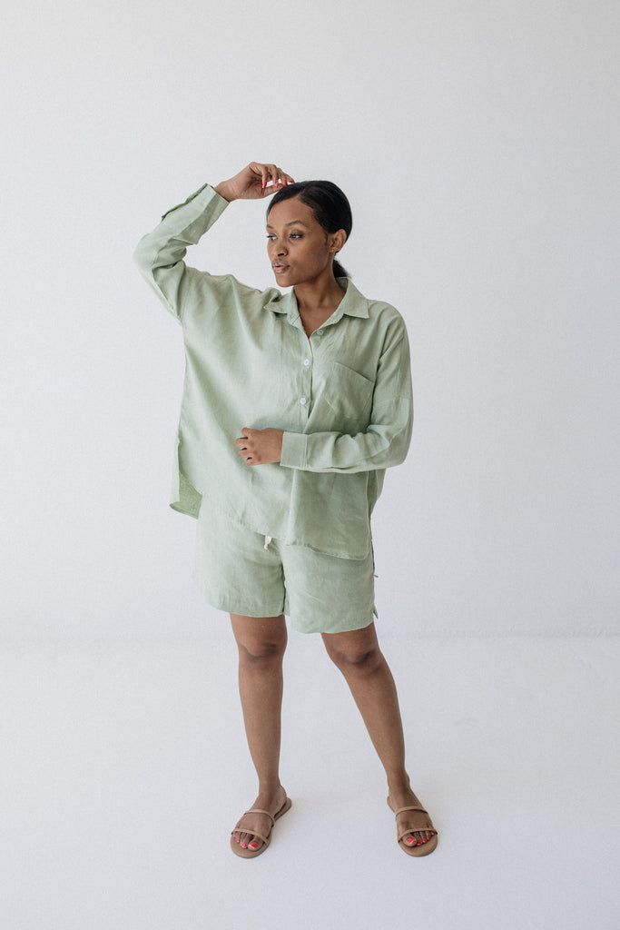 Mid-rise fit, sits just below the belly button. The Midi Linen Shorts fit slightly longer on the leg compared to the regular Linen Shorts.