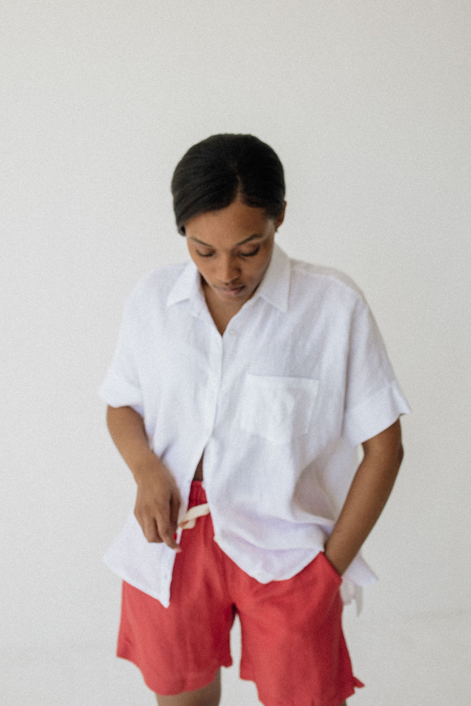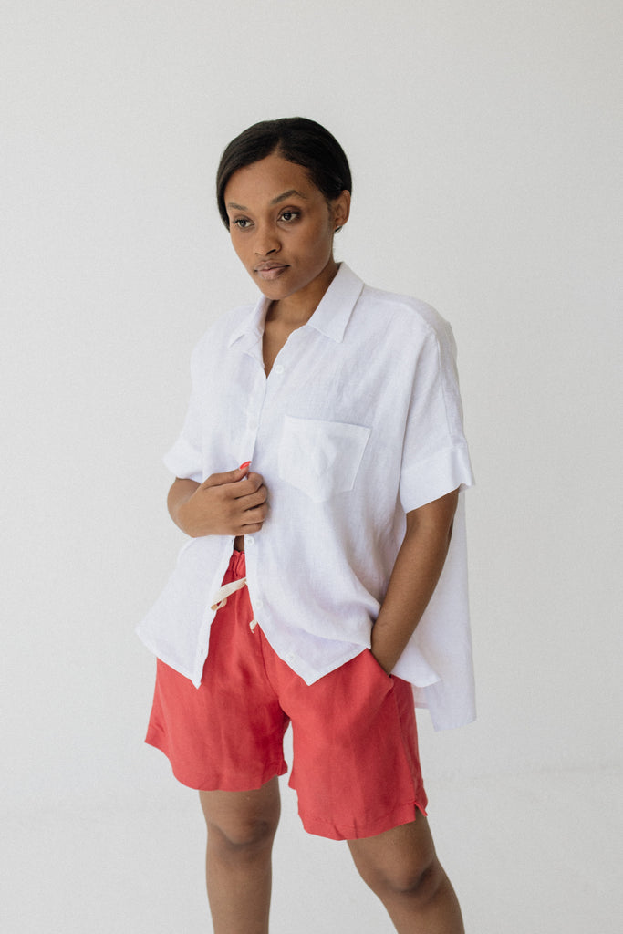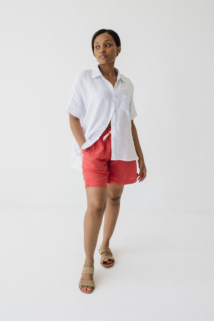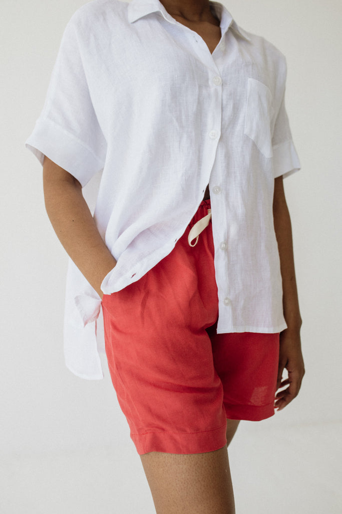 Mid-rise fit, sits just below the belly button. The Midi Linen Shorts fit slightly longer on the leg compared to the regular Linen Shorts.